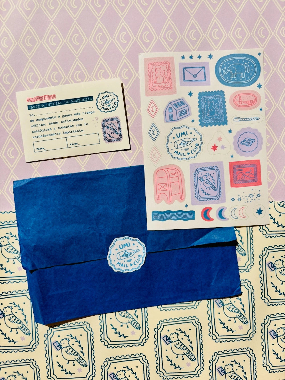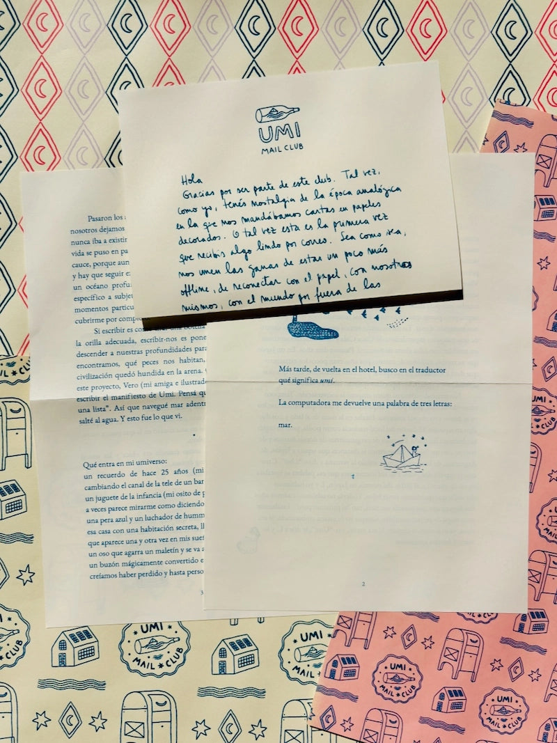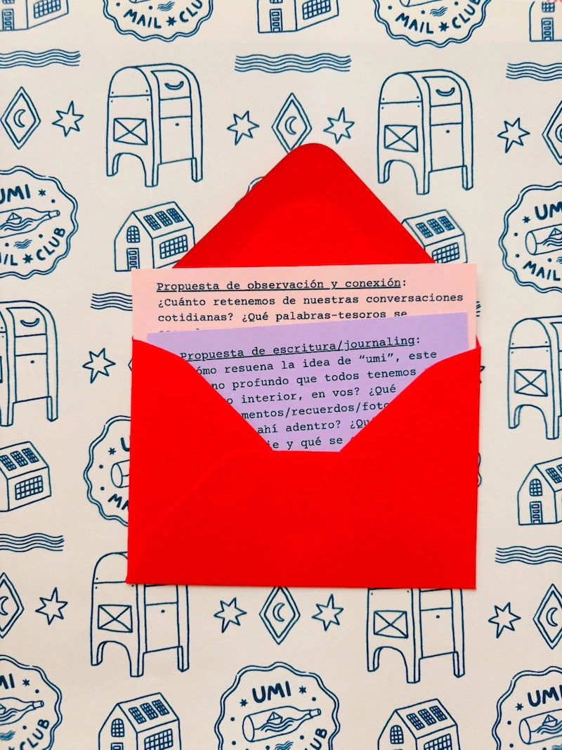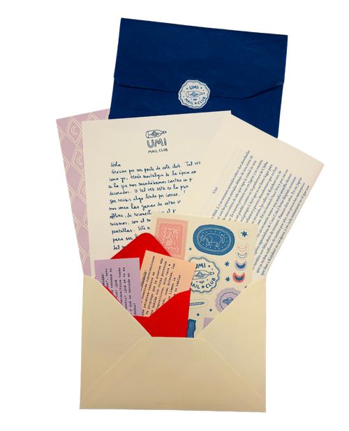 Umi mail club es una experiencia analógica y slow que llega cada mes por correo tradicional al buzón de tu casa. Es un ritual de lectura, escritura y creatividad que te invita a bajar la velocidad, desconectar de las pantallas y conectar con las historias, el papel, las texturas, tu mundo interno y lo que te rodea.